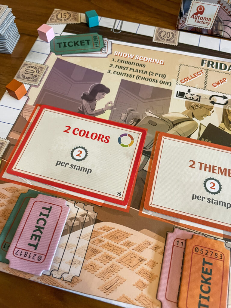 Finally comes the Show Phase, when players place their new stamps and attendee cards into their albums. Exhibitors and specialists are added to the right side of the mat, while stamps must fit carefully into the grid of the album, like pieces of a colorful puzzle. After placement, players score points for their exhibitors, for holding the first-player token, and by entering one of the contests displayed on the board. Each contest has its own criteria, from focusing on colors and themes to rewarding clever arrangements. Show tickets mark which contests you’ve entered, forcing you to pursue different challenges each round.