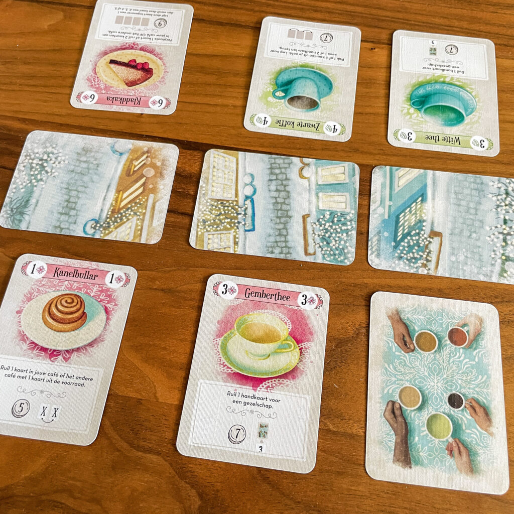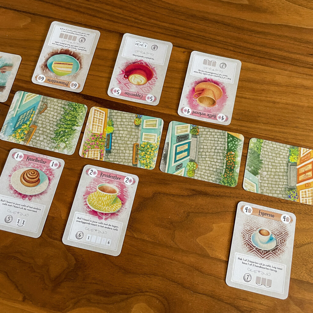 Hoe wordt het spel gespeeld? Als eerste leg je de vijf straatkaarten in het midden neer. Je mag kiezen of dat je met het zomer of het winter tafereel speelt. Zorg ervoor dat je aan beide kanten van de straat plek houdt om kaarten neer te leggen. Schud hierna de 18 cafékaarten en vorm een trekstapel, trek vier cafékaarten en leg die open neer als voorraad, hier moeten minstens twee verschillende kleuren en drie verschillende cijfers liggen.