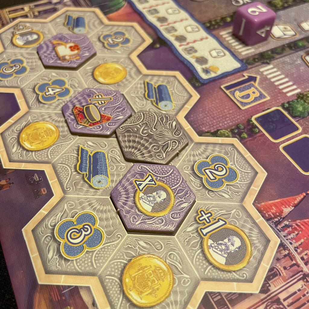 So, on your very first turn, you’ll still do the familiar actions from the base game, but now you also watch for ways to move your Pedestrians, meet Amenity conditions, and build up their Joy for valuable points and bonuses.