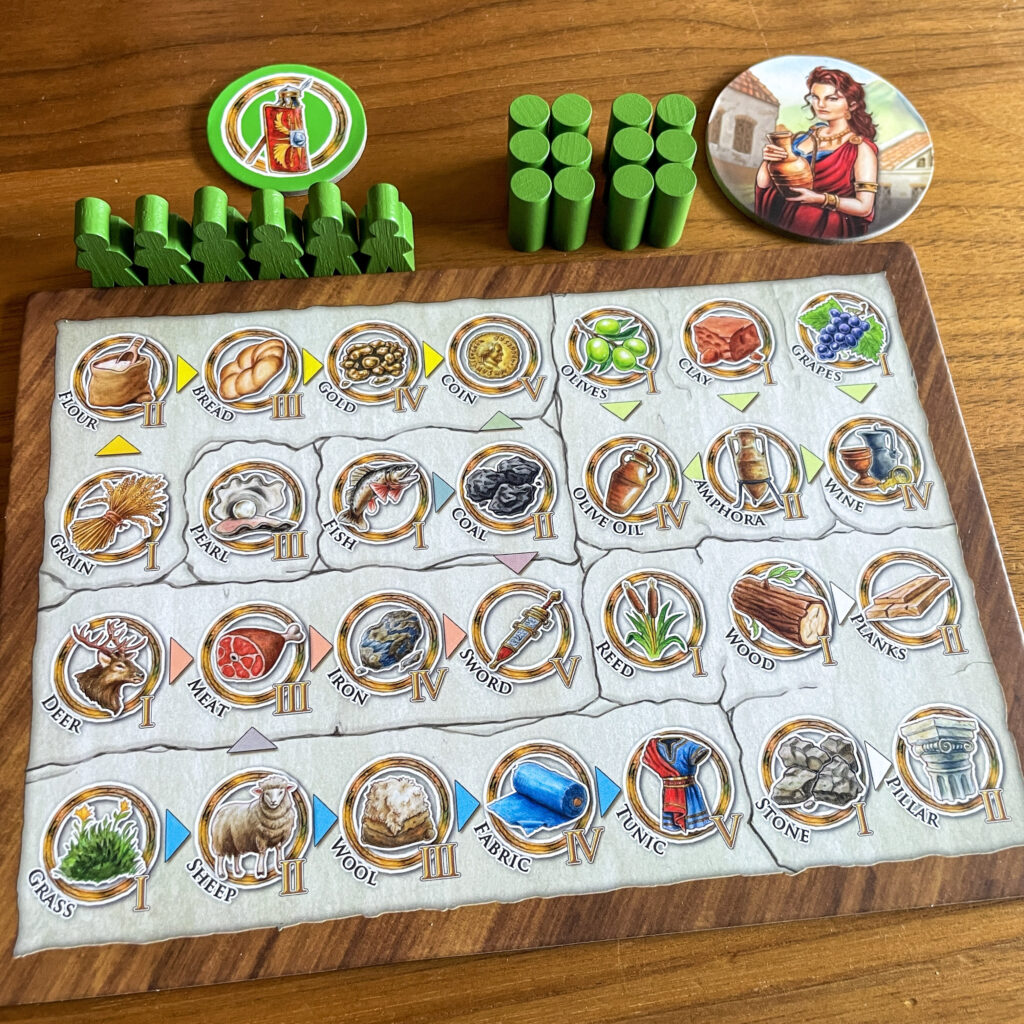 Elke speler neemt een voorraadbord en pakt van dezelfde kleur drie werkers, een offermarker en alle eigendomsmarkers. De overige drie werkers en het Romeinse legertoken blijven in de algemene voorraad.
