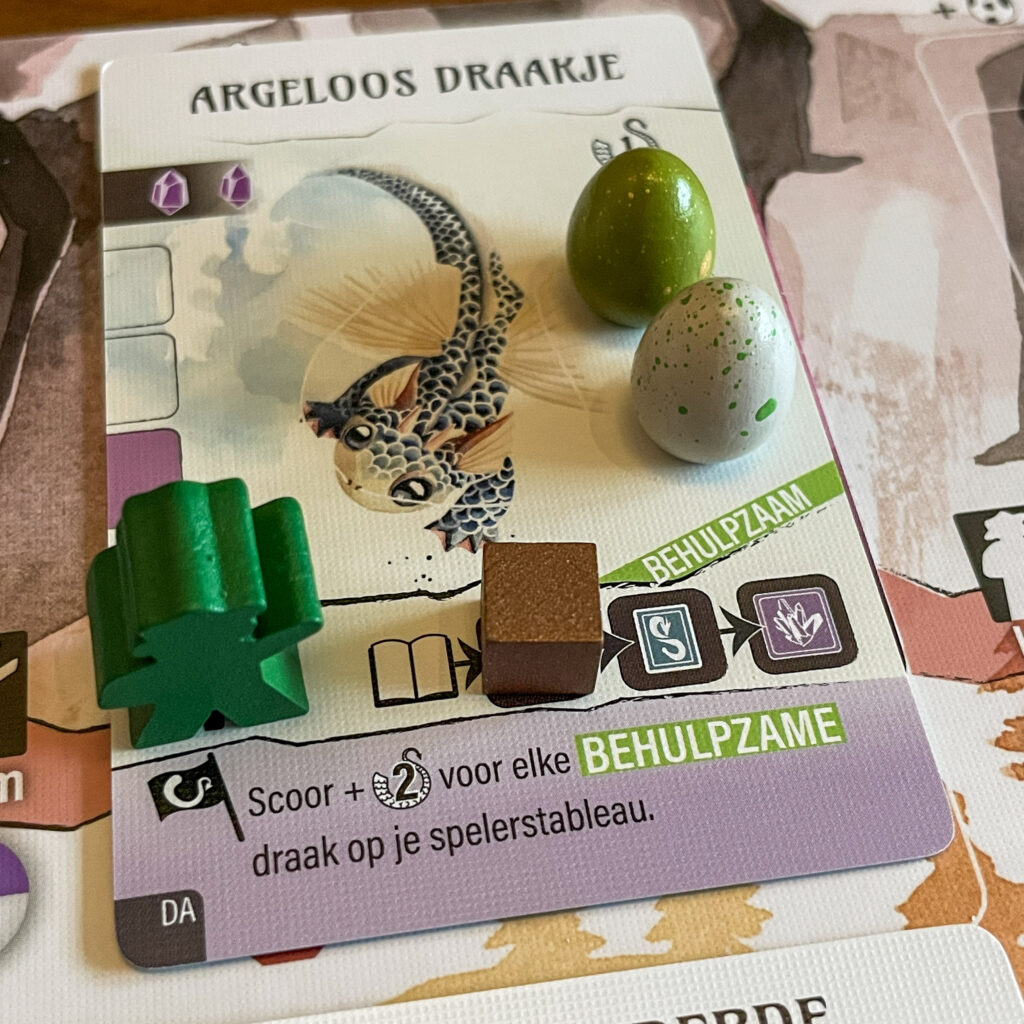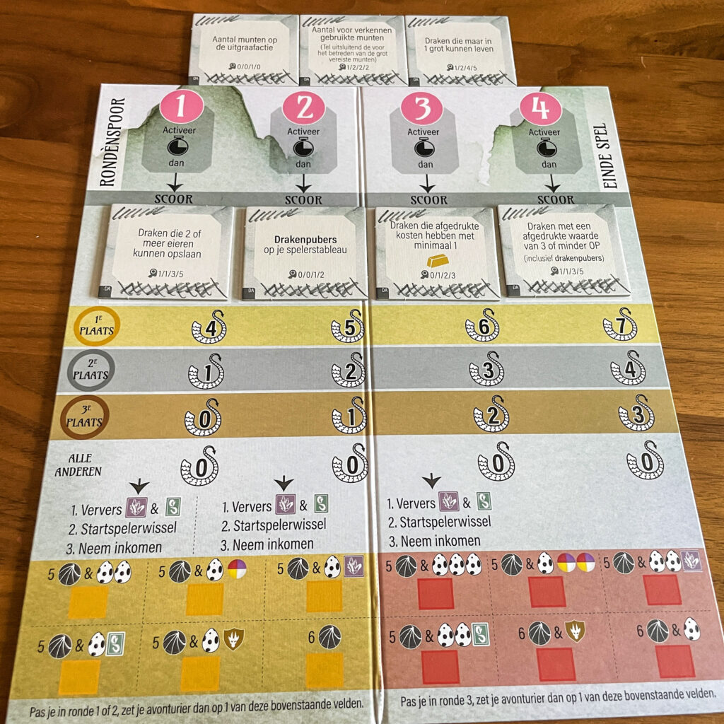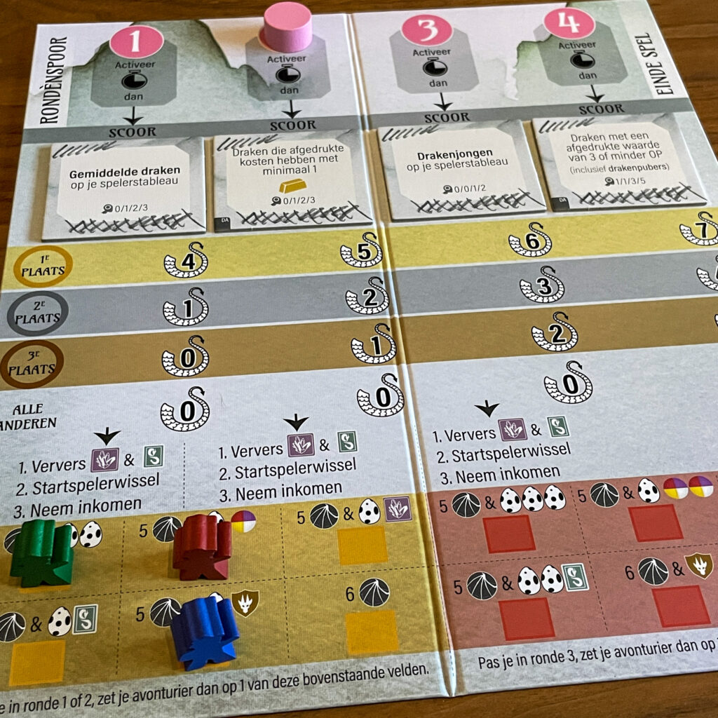 Aan het artwork is verder niets veranderd, en dat is juist fijn. Wat wel een interessante toevoeging is, is dat je aan het einde van de eerste rondes nu zelf je einde rondebonus mag kiezen. Dat maakt de keuzes meteen een stuk strategischer. Soms is het nu slimmer om eerder te passen en alvast een bonus voor de volgende ronde binnen te halen en voorkomen dat iemand ander ermee vandoor gaat. Hierdoor ga je anders plannen, zal je soms iets moeten bewaren en bewuster toewerken naar de volgende ronde. De drakenpubers zijn ook erg leuk, sowieso al dat je deze moet trainen en pas als ze volledig getraind zijn dan pas geactiveerd kunnen worden met hun vaardigheid. Maar aan het eind van het spel kan je hier ook nog eens flink qua punten mee scoren.
