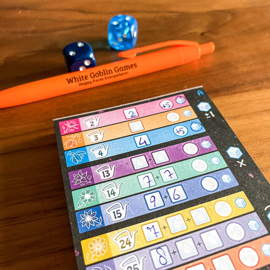 Lukt het om een plant zoveel water als aangegeven staat te geven, dan ontvang je 5 punten, geef je een plant teveel of te weinig water dan levert dit een getal op aan minpunten. Heb je drie rijen in 1 gebied voltooid door de juiste getallen te dobbelen, dan krijg je de bijbehorende dobbelsteenbonus, welke je op elk moment mag inzetten. 🎲