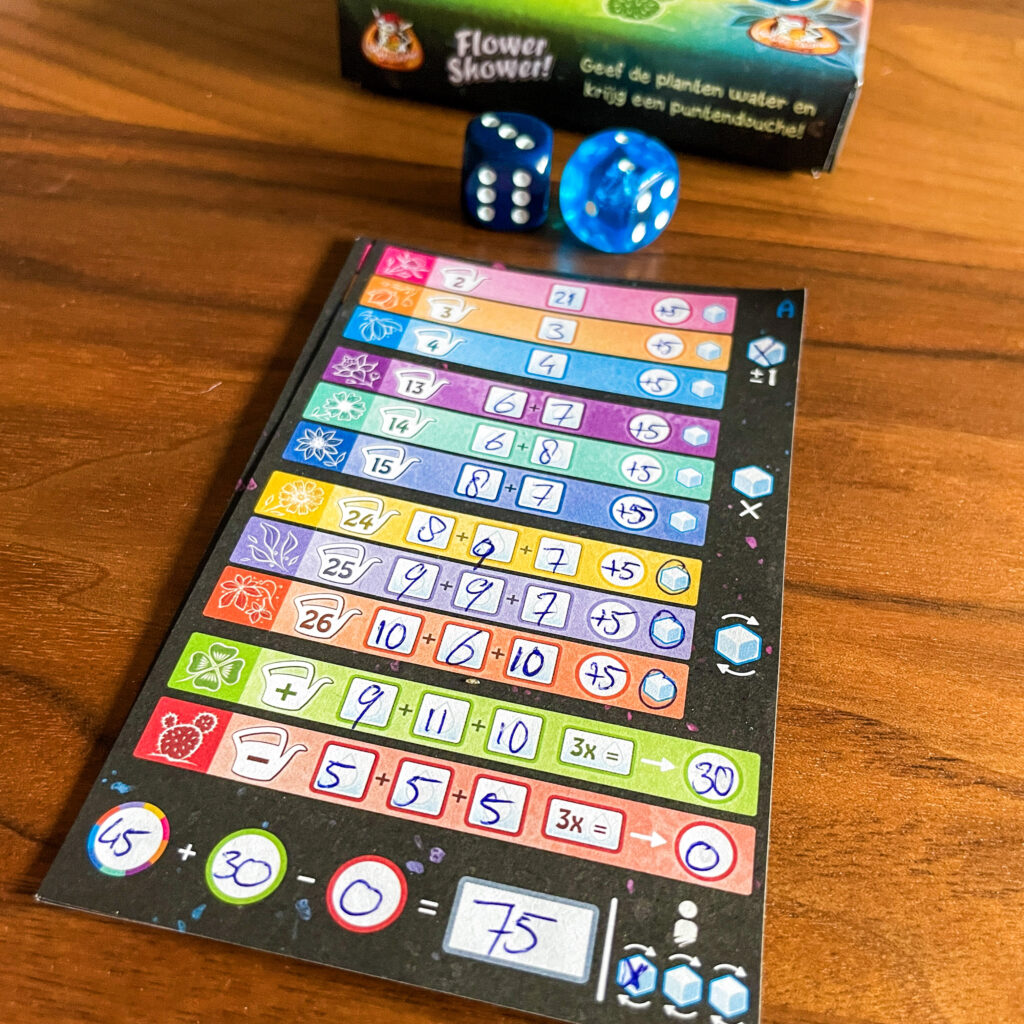 Flower Shower is een leuk en snel dobbelspelletje, duidelijke regels en heerlijk kleurrijk. Het thema voelt er wel een beetje opgeplakt maar heel eerlijk dat doet niets af aan het spel. Het tactische is erg leuk gedaan, je zult steeds een keuze moeten waar je een resultaat neerzet maar ook voor welk getal kies je bij het klavertjevier en de stekelige cactus? Wij vinden hem erg leuk en hebben deze alweer meerdere keren gespeeld, inclusief wat solopotjes. De dobbelstenen met de druppels zijn er leuk gedaan! Qua herspeelbaarheid krijg je zowel een A als een B-kant.