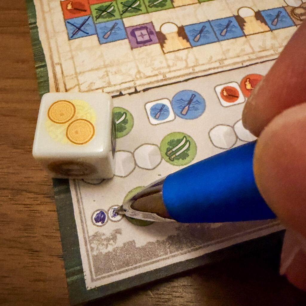 In het middelendeel kun je middelen creëren door of dobbelstenen of munten in te leveren. Zodra je iets ingezet hebt, kruis je het betreffende middel door. Met de juiste symbolen kom je steeds verder de expeditie in, elk terrein vraagt om specifieke combinaties. Zodra je het afgesproken aantal tempels bezocht hebt kan je El Dorada bereiken en ben jij de winnaar van deze variant van De zoektocht naar El Dorado.
